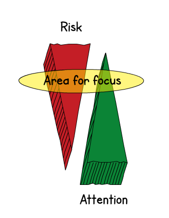 So when you’re wondering where you should be focussing your attention, don’t just look at the prioritized list of risks. Also, think about how much time and effort has been allocated already and where. Then identify the most significant risks which are receiving the least amount of attention. (And don’t forget to look in the corners.)